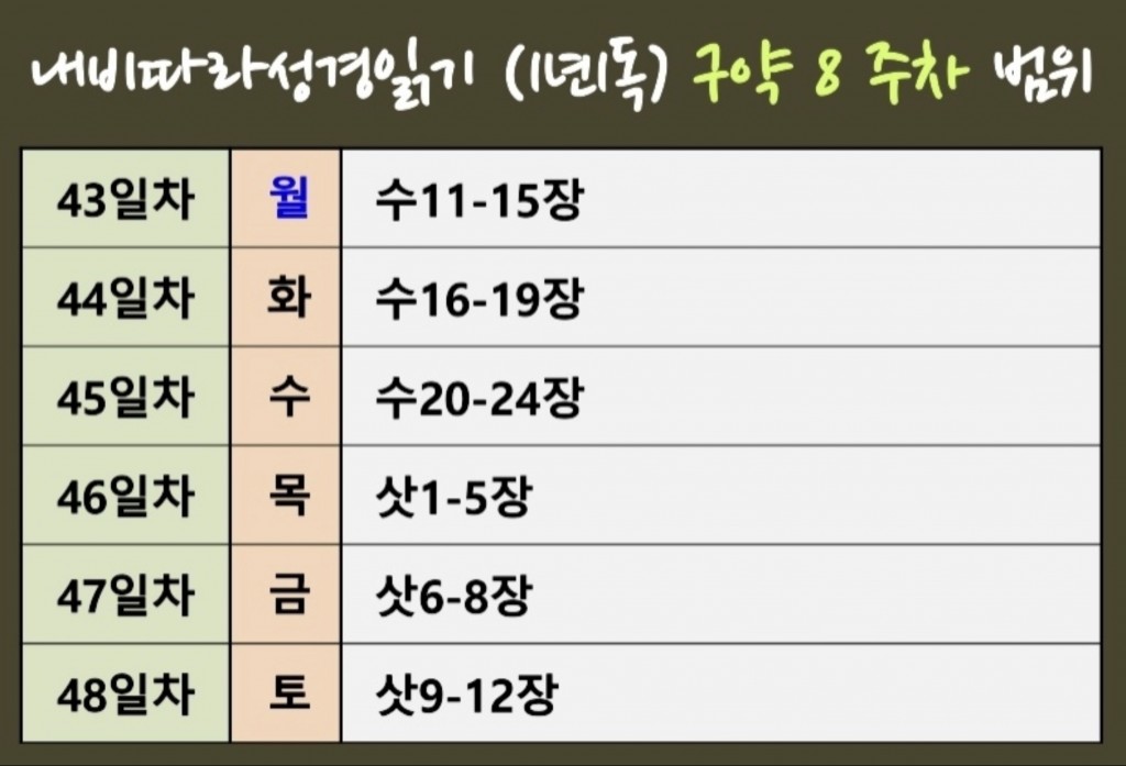 링크 공유 페이스북 카카오톡 트위터 목록 성경읽기 구약 8주차 범위 페이지 정보 작성자 최고관리자 이메일 admin@domain.com 작성일 2026-03-09 본문 성경읽기 구약 8주차 범위 이전글 성경읽기 구약 9주차 범위 26.03.11 목록 다음글 성경읽기 구약 7주차 범위 26.03.09